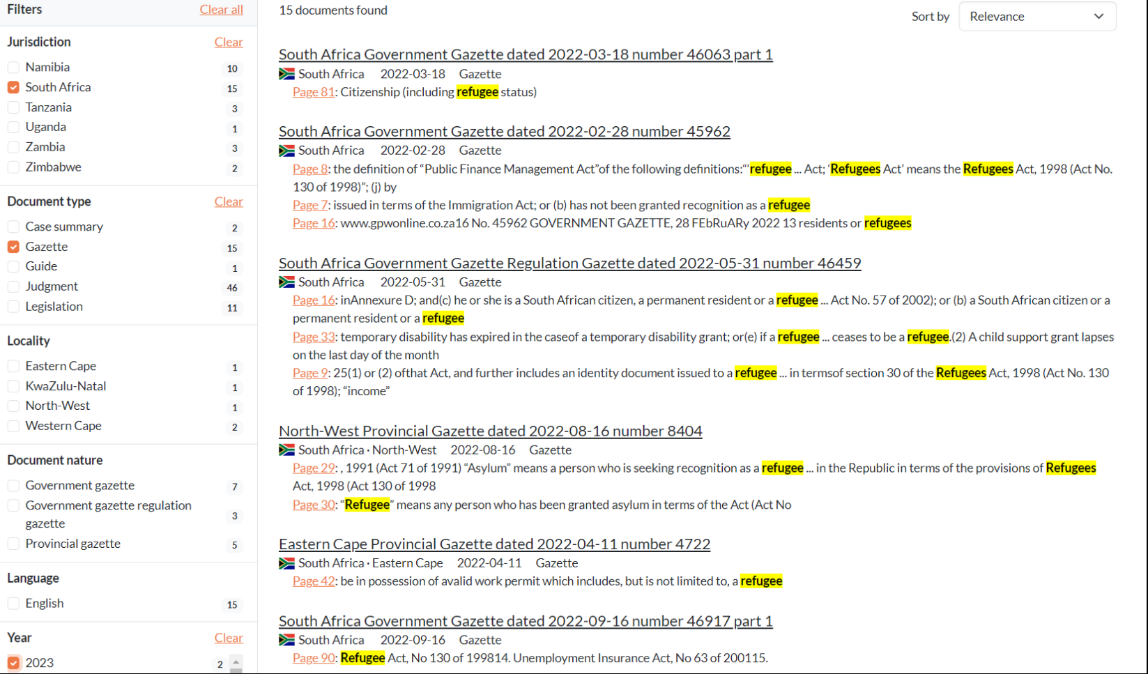 Apply multiple filters to refine your search. Let’s look for Gazettes with the term refugees from 2023 in South Africa.