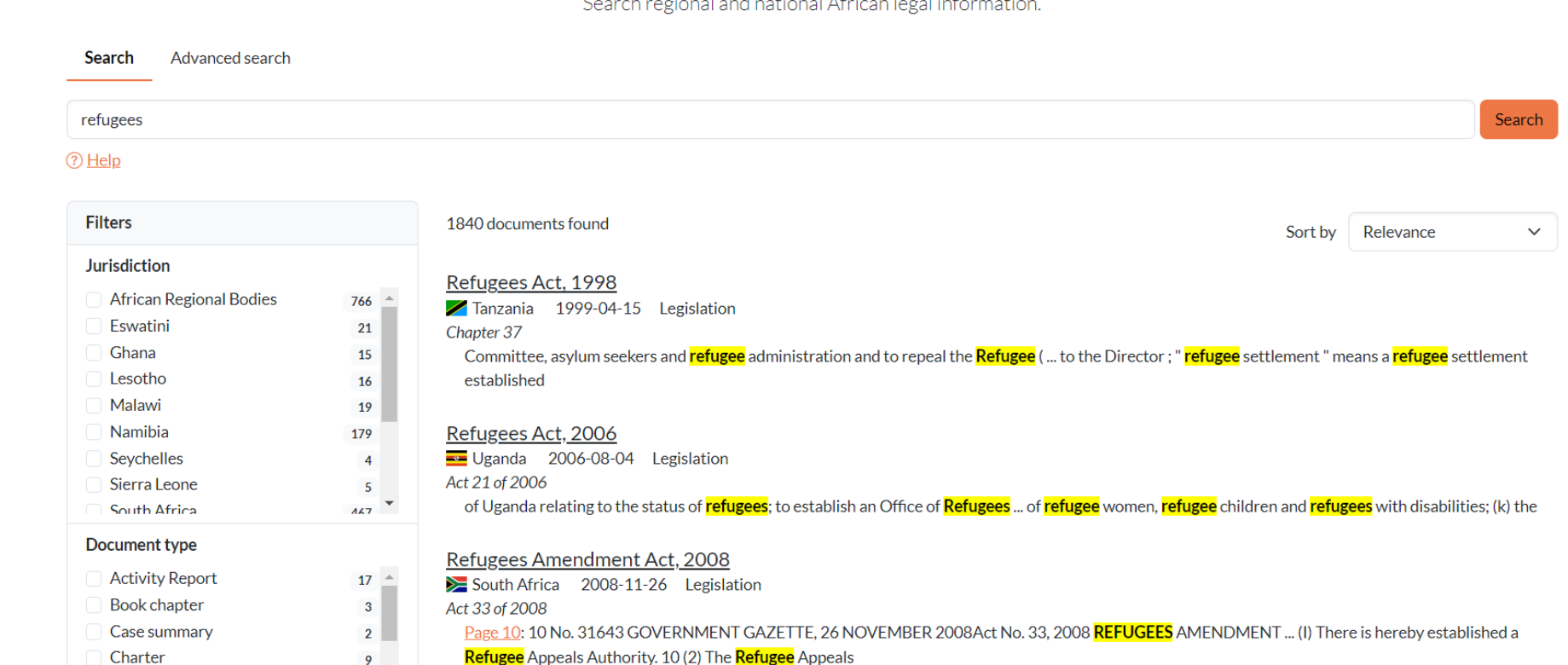 Here’s an example. A search for "[refugees ](https://africanlii.org/search/?q=refugees)"returns over 1840 documents.