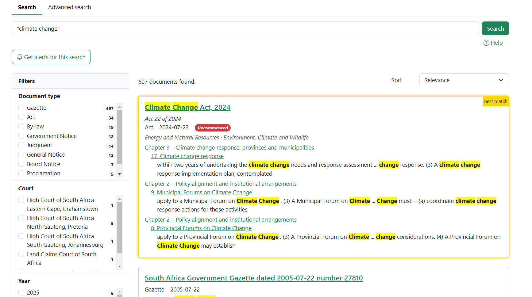 Here’s an example. A search for **"climate change"** returns over 600 documents.